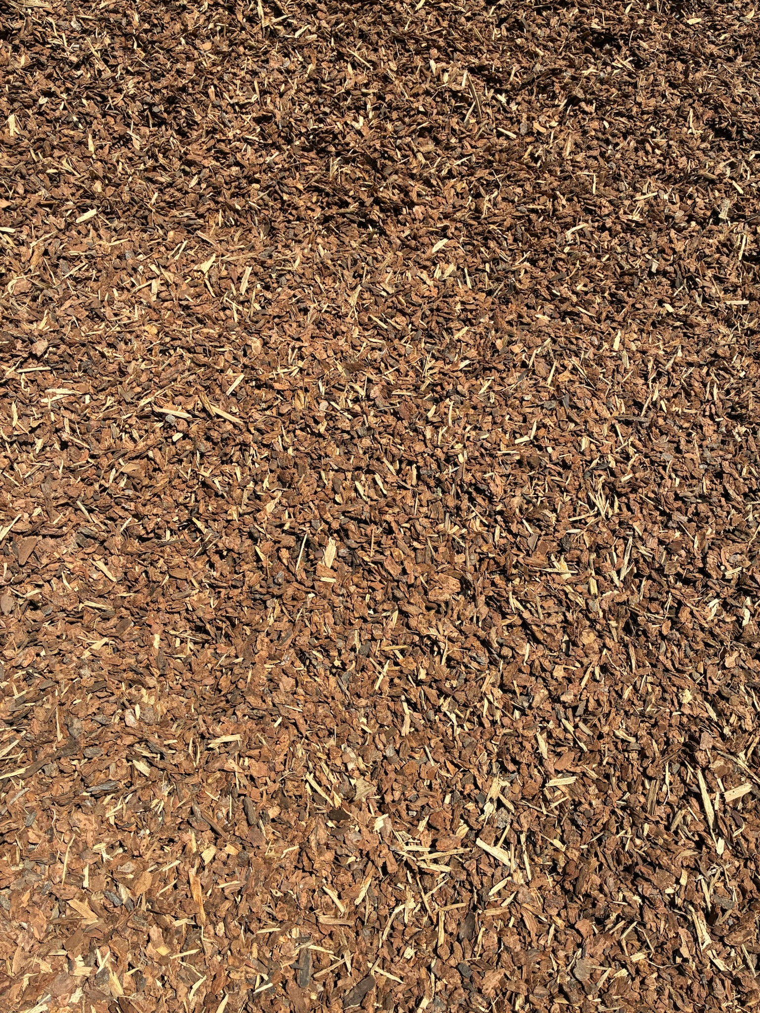 A fine dark brown mulch with some pieces of lighter heartwood from the debarking process. The bark material is ponderosa pine or fir. Attractive and formal appearance with long lasting effects. It is also 100% virgin wood product that is sold by the yard or by the semi load.
