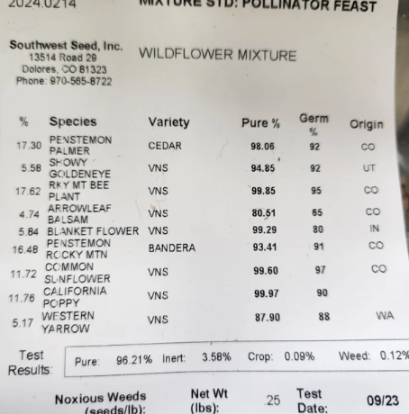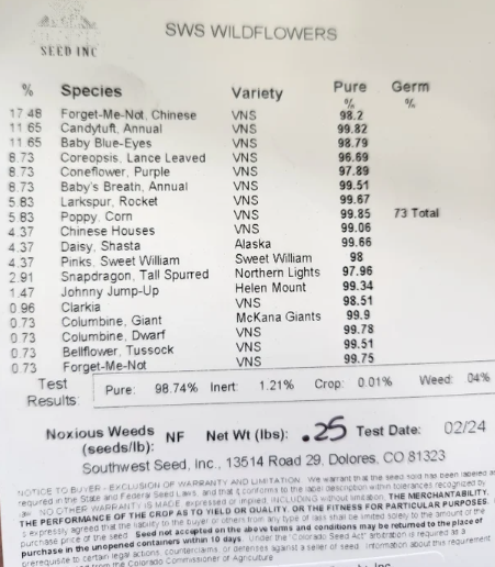Heidi’s Highland mix was created for our Mountainous regions in the Southwest Four Corners region. It is a blend of annuals and perennial wildflowers. The annuals are added to the mix to bloom the year that you plant while the perennials will start to bloom when they reach maturity the second year. If you allow flowers to go to seed and Then scratch the seeds into the soil beneath the plants in the fall, there is a good likelihood you will continue to propagate the annuals in subsequent years. Created for elevations in the 7,000 – 10,000′ elevation range, these plants are winter hardy. These are relatively drought tolerant plants but there is an assumption that the higher elevations get more summer moisture than the lower altitudes. If you don’t get summer moisture then supplemental moisture may be critical for establishment and good blooms. The seeding rate is 0.25 lbs/1000 ft² Zone: 3-5 Min. Precipitation: 15”-20"